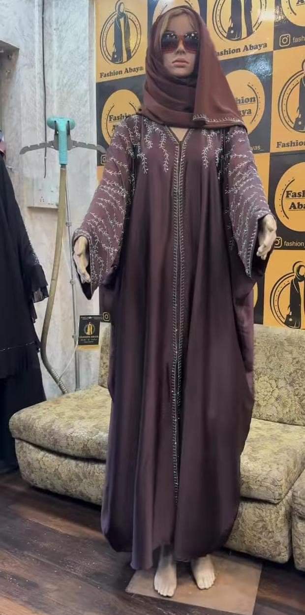 Sophisticated cocoa brown open Abaya adorned with premium quality AMC silver leaf and floral stone work on shoulders and center panel. The warm neutral tone with shimmering accents creates a refined look. Comes complete with matching hijab and belt.