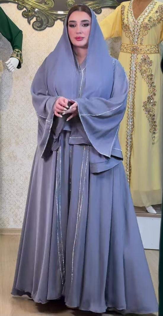Graceful silver grey chiffon open Abaya featuring premium quality AMC subtle stone vertical line detailing. The soft flowing fabric and hooded design create a light, ethereal look ideal for any season. Comes complete with matching hijab and belt.